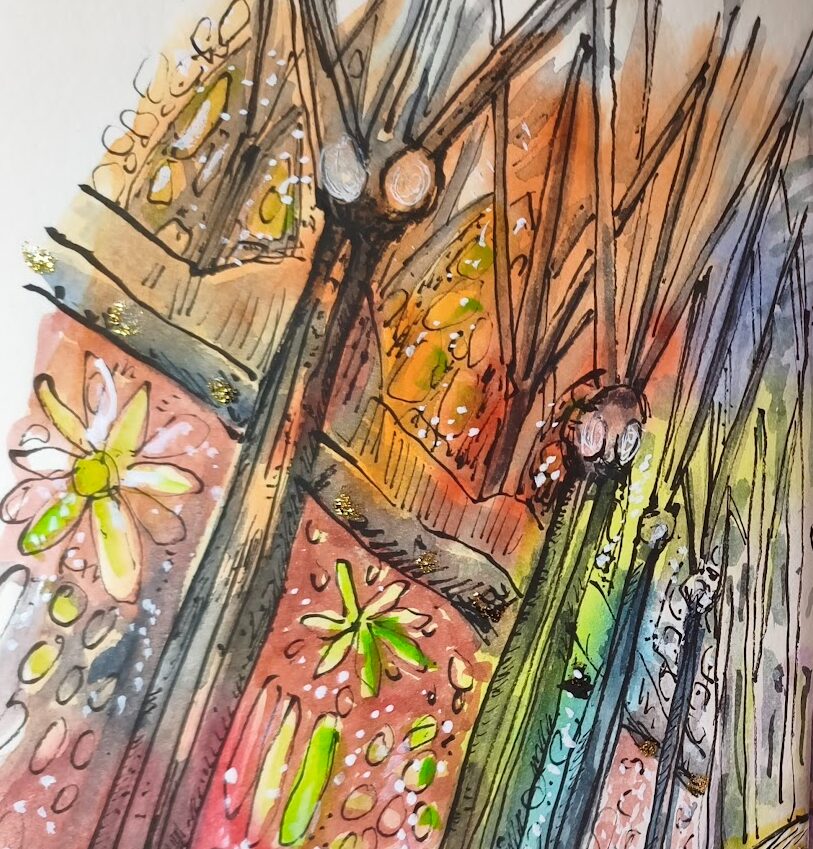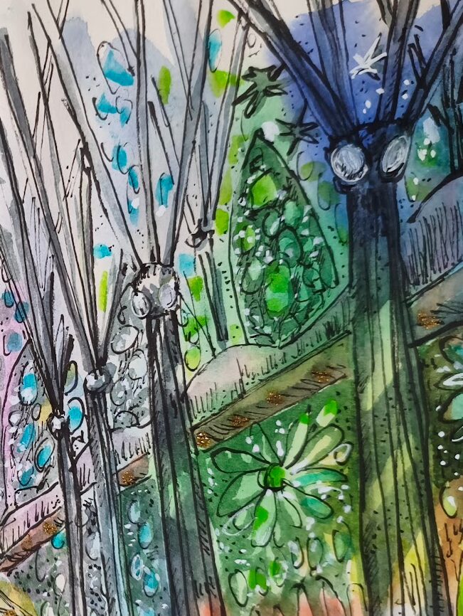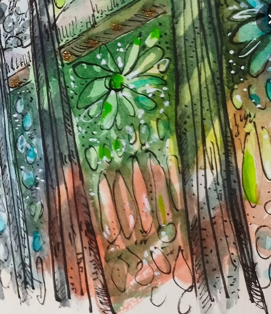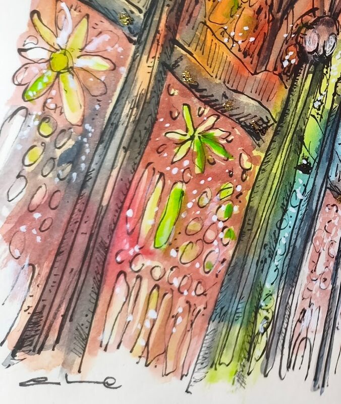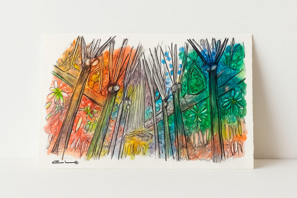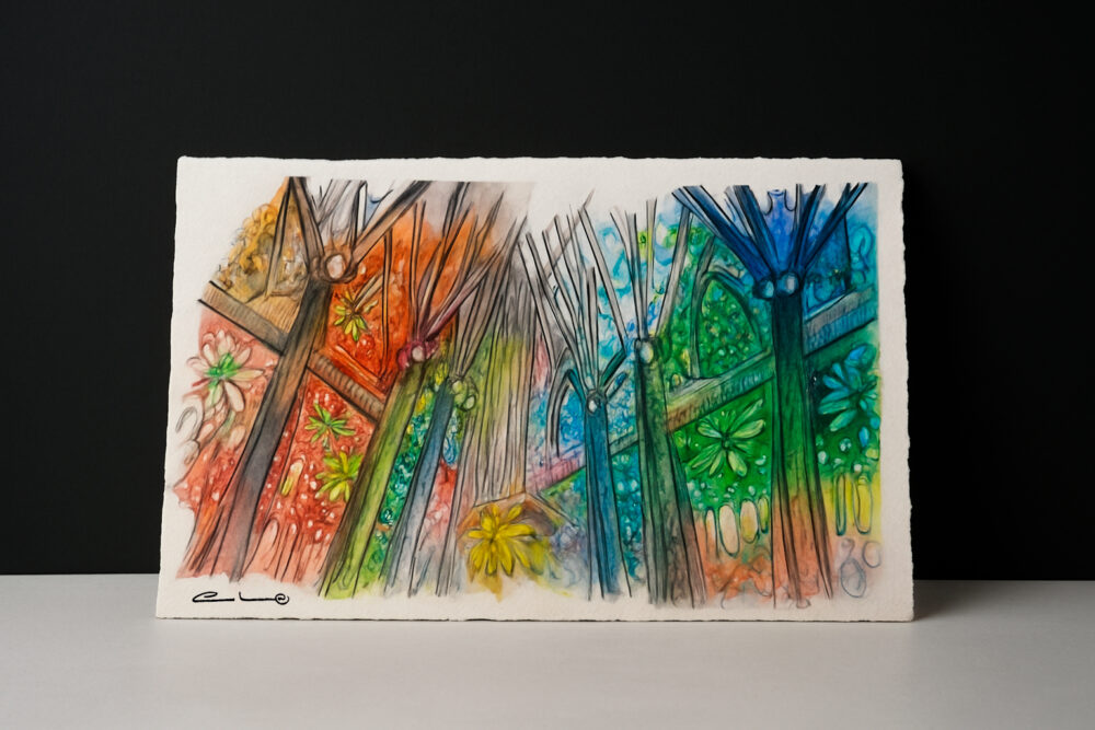 Los pilares —elevados como árboles de piedra— guían la mirada hacia el cielo, mientras la arquitectura se transforma en un bosque espiritual inundado de color. La pincelada suelta y la tinta nerviosa enfatizan el movimiento de la luz, creando una atmósfera vibrante en la que todo parece respirar. La obra transmite la fascinación de una visitante que, viniendo de La Mancha, contempla un interior que vibra, se expande y se ilumina con una intensidad casi mágica.