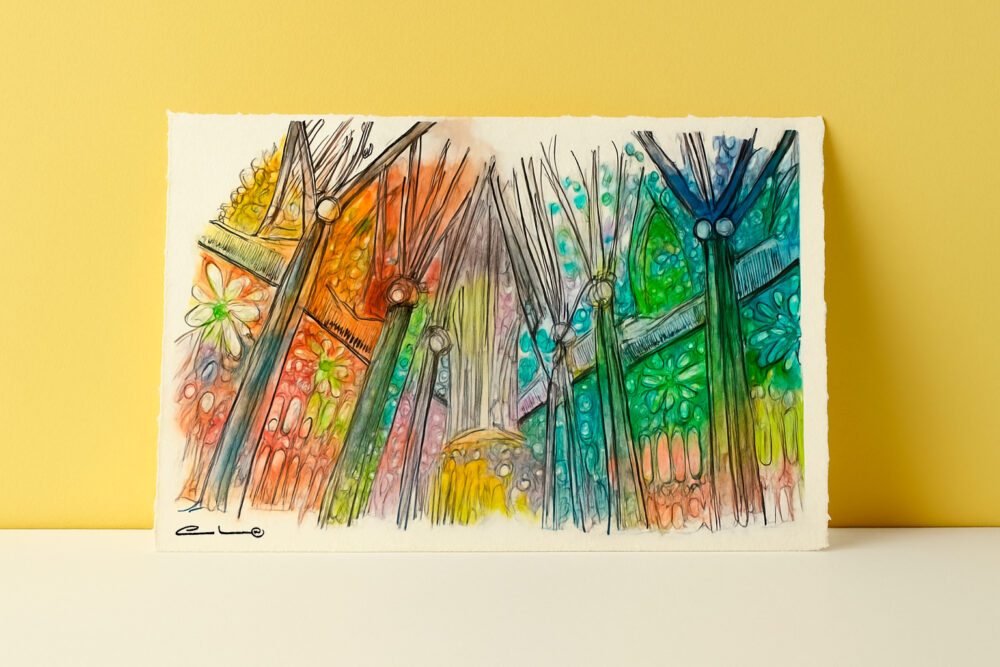 Esta acuarela representa el interior de la Basílica de la Sagrada Familia en un día radiante en Barcelona, vista a través de la sensibilidad luminosa de los rayos del sol. La escena captura cómo la luz del sol atraviesa las vidrieras multicolores del templo y se descompone en un estallido de tonalidades cálidas y frías: rojos, amarillos, verdes y azules que se proyectan sobre columnas, suelos y muros como un mosaico vivo.