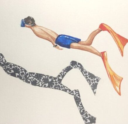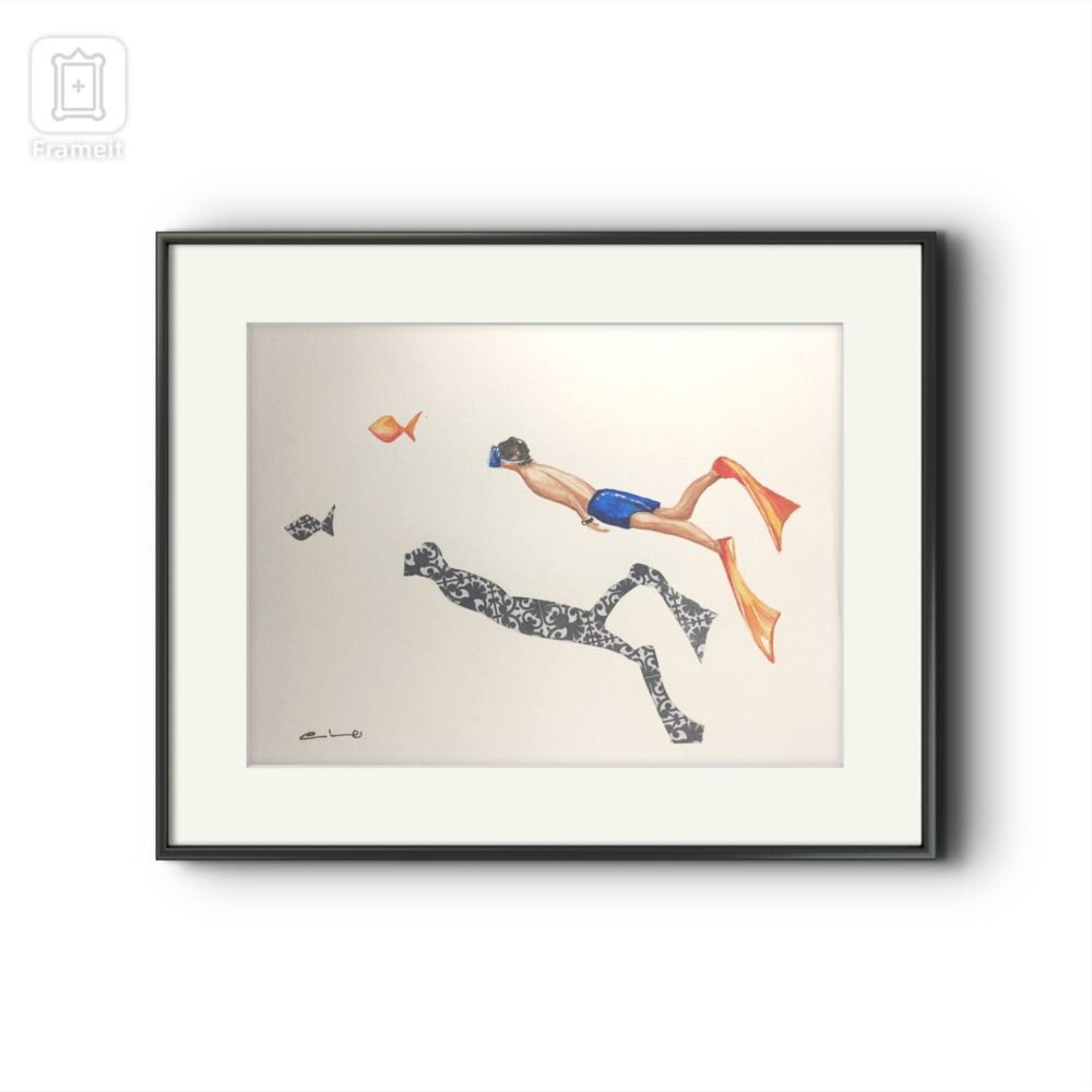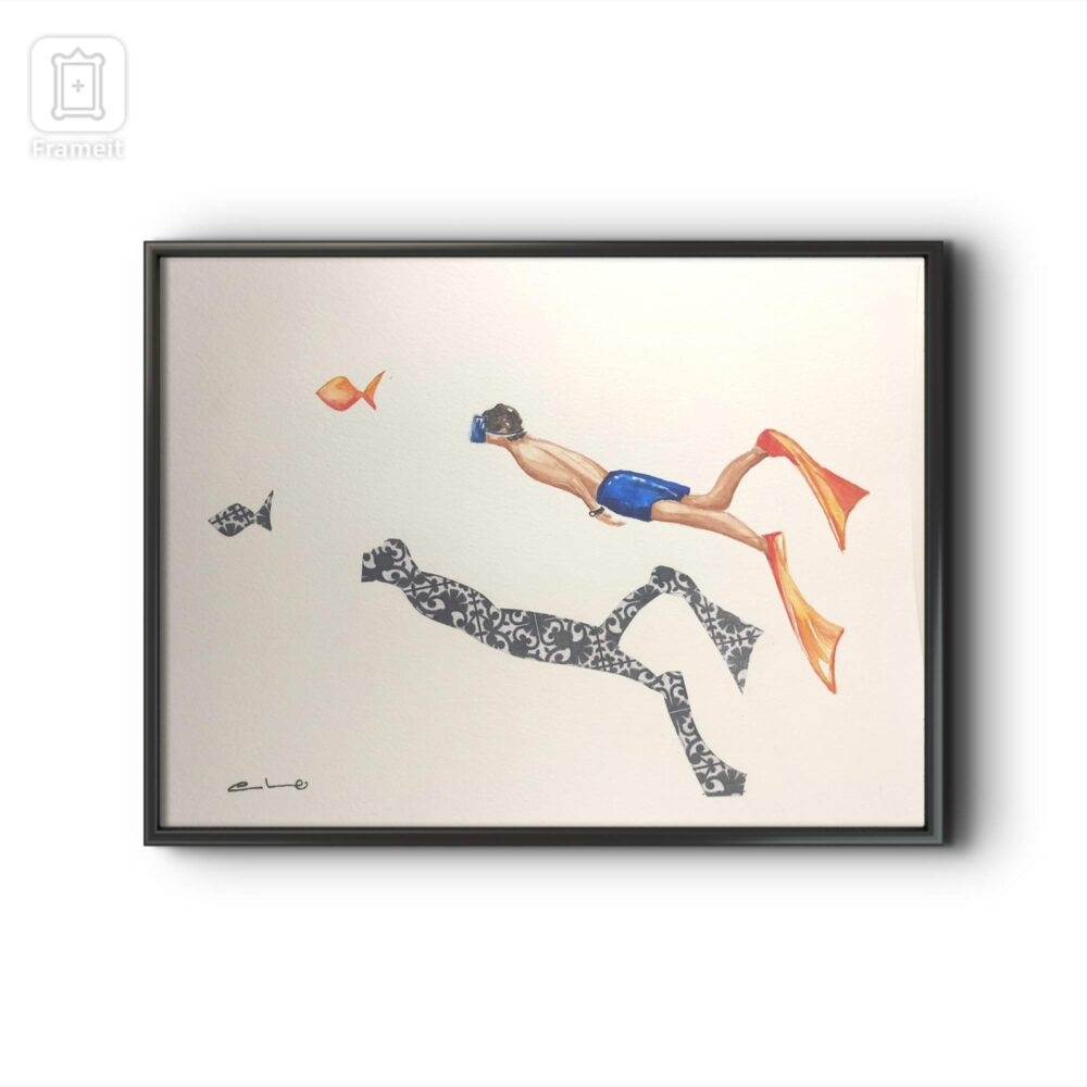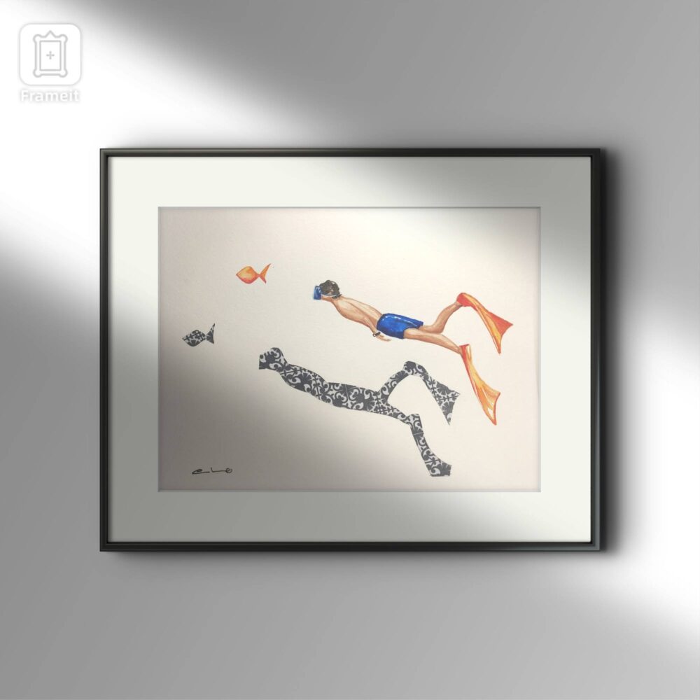 Serenidad representa a un buceador sumergido en aguas tranquilas, acompañado por peces y por una figura-sombra decorativa que lo refleja de forma simbólica. La escena transmite una sensación inmediata de quietud y equilibrio. No hay tensión ni movimiento abrupto: solo la cadencia lenta de la inmersión.