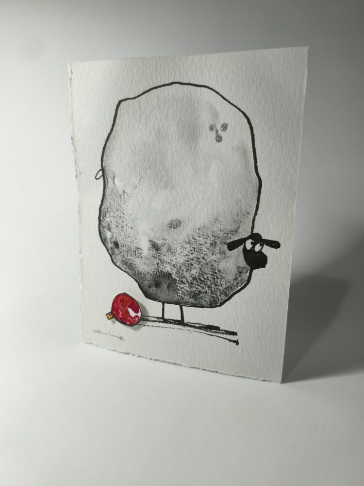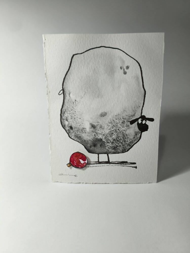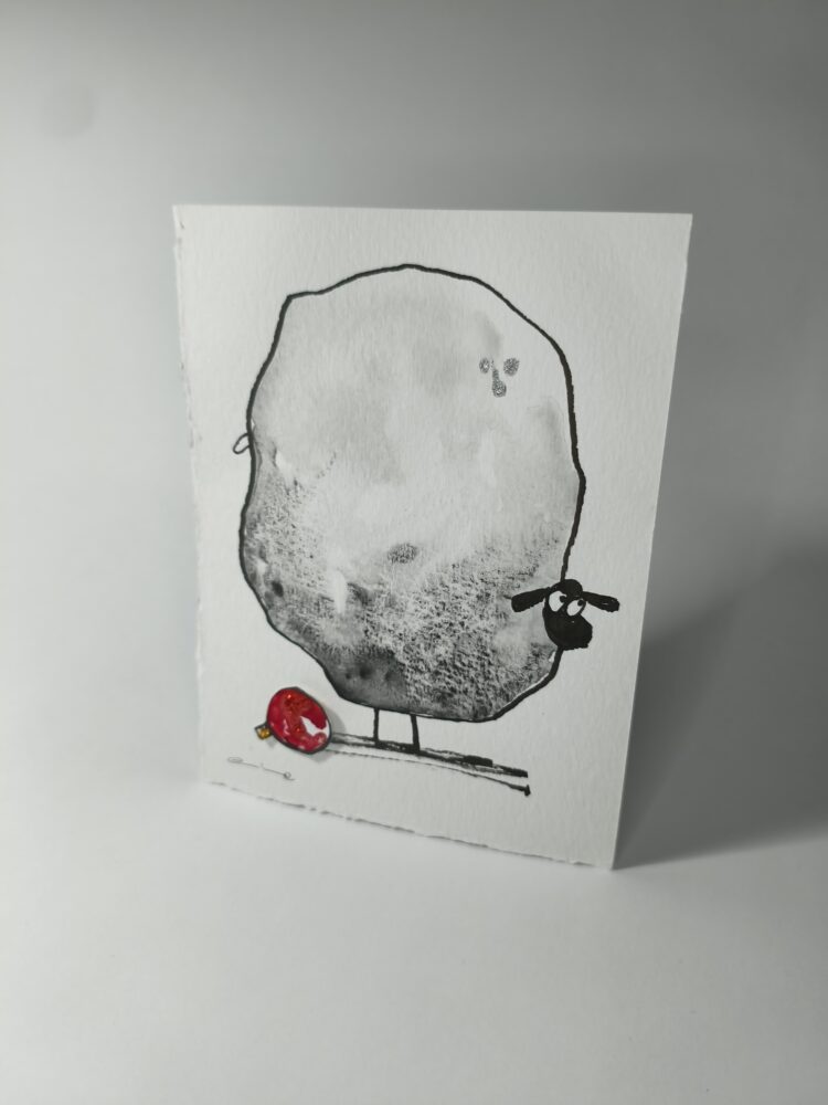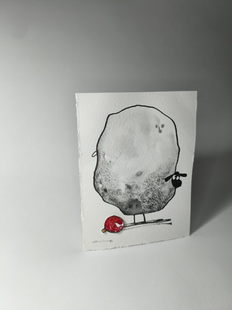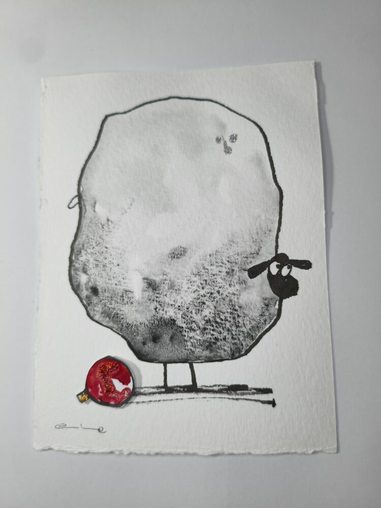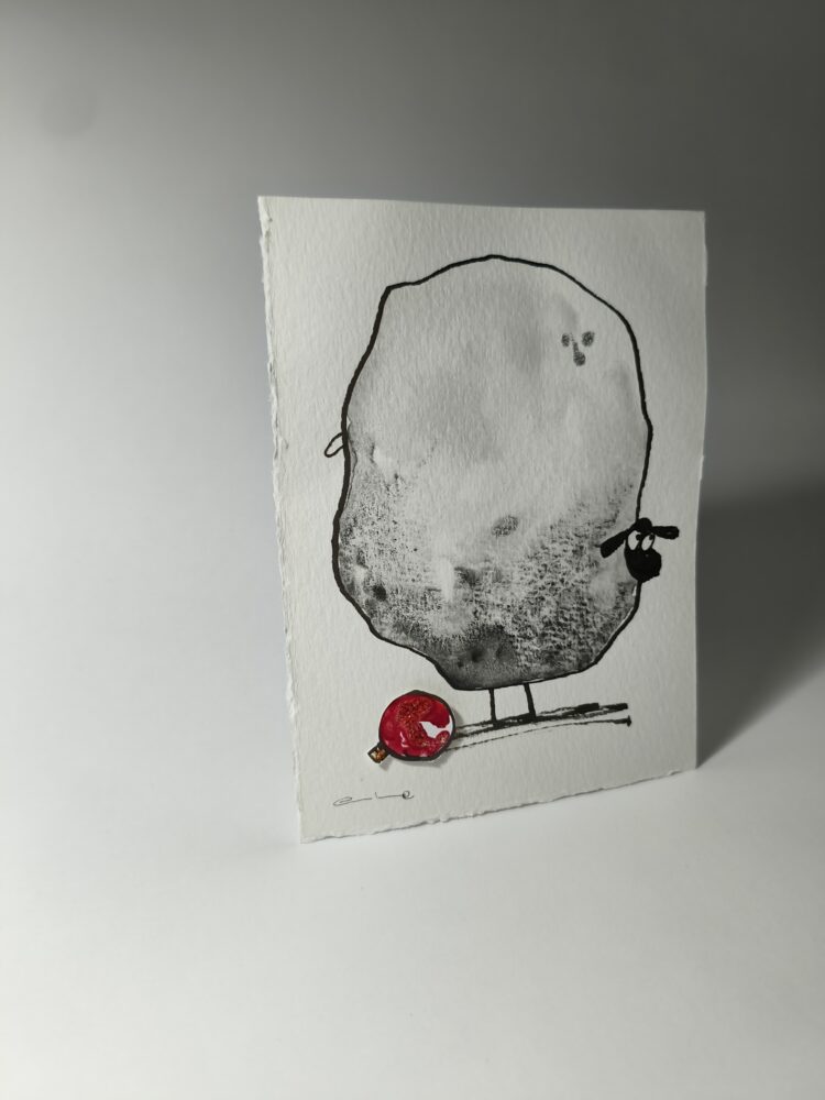 Cada pieza está pintada a mano en acuarela, con una ovejita que te mira con una mezcla irresistible de ternura y picardía. A sus pies, una bola roja de Navidad recuerda que trae consigo la magia de estas fechas… y quizá alguna travesura.