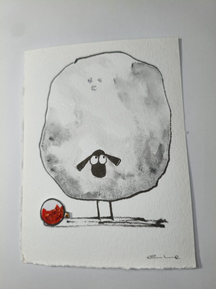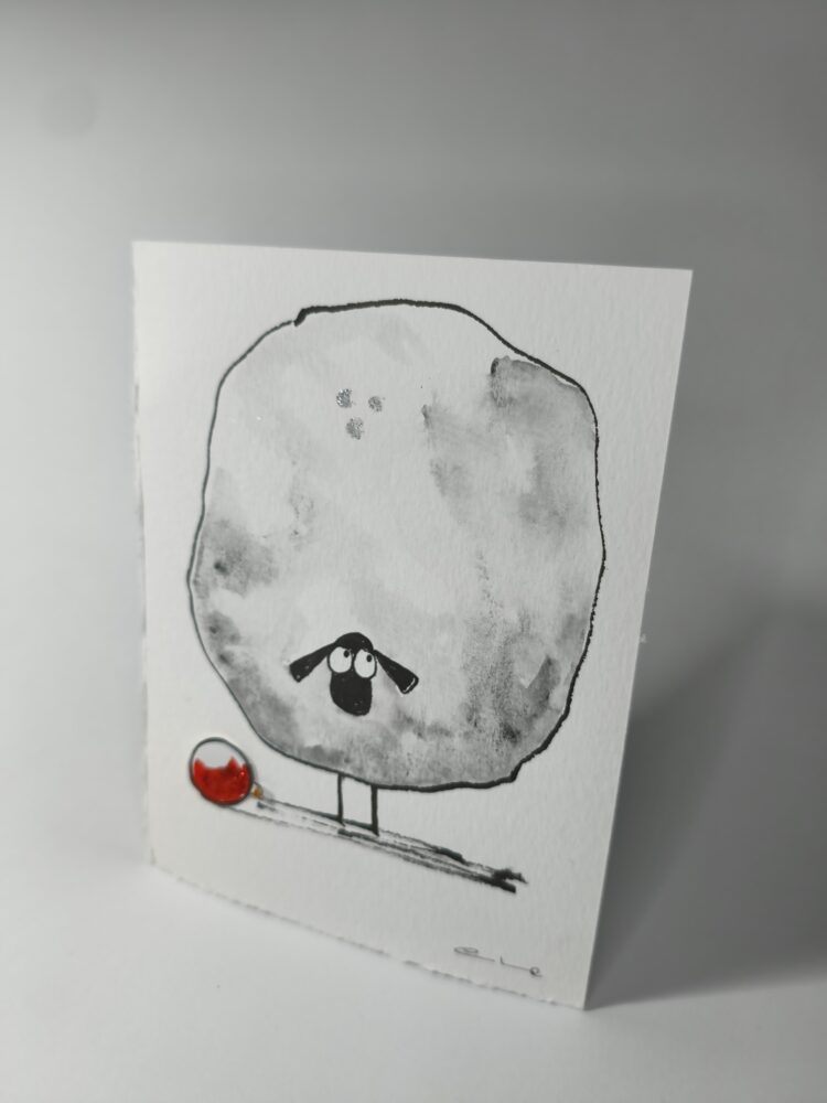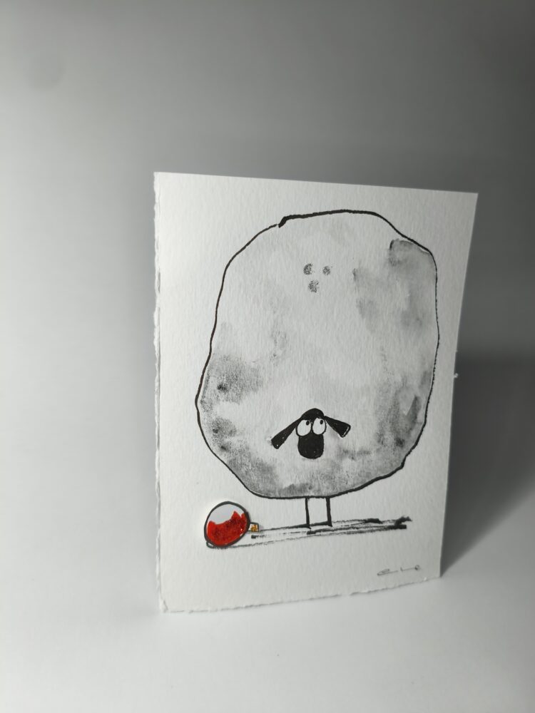 Cada pieza está pintada a mano en acuarela, con una ovejita que te mira con una mezcla irresistible de ternura y picardía. A sus pies, una bola roja de Navidad recuerda que trae consigo la magia de estas fechas… y quizá alguna travesura.