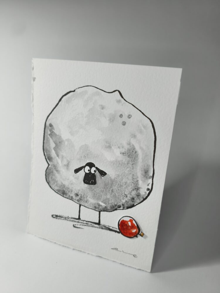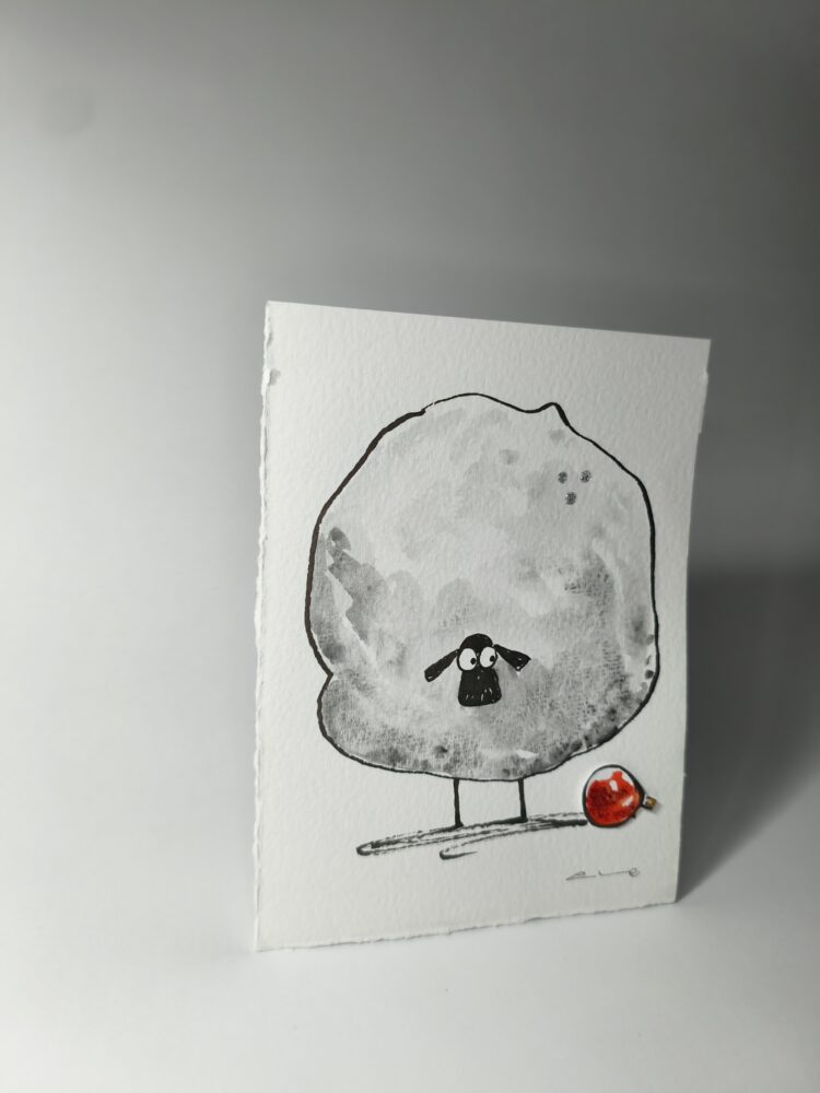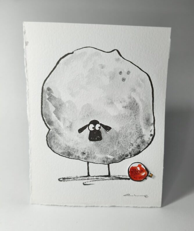 Cada pieza está pintada a mano en acuarela, con una ovejita que te mira con una mezcla irresistible de ternura y picardía. A sus pies, una bola roja de Navidad recuerda que trae consigo la magia de estas fechas… y quizá alguna travesura.