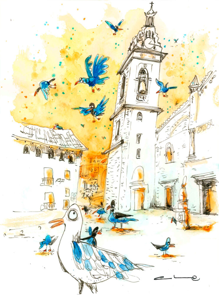 Hoy… las palomas y los pajarillos la acompañan en esta acuarela.