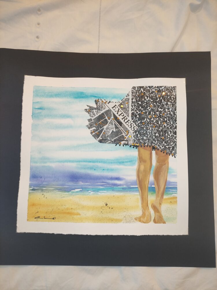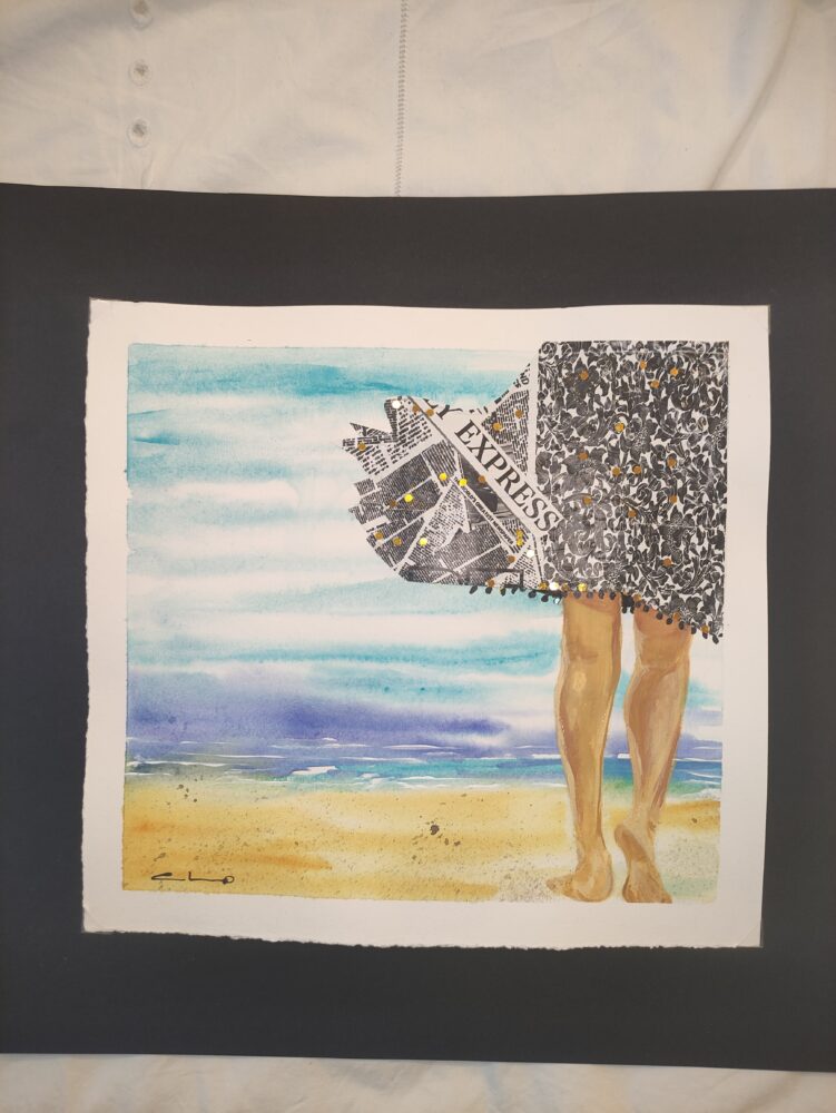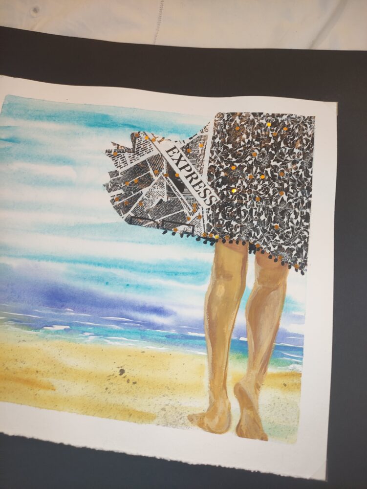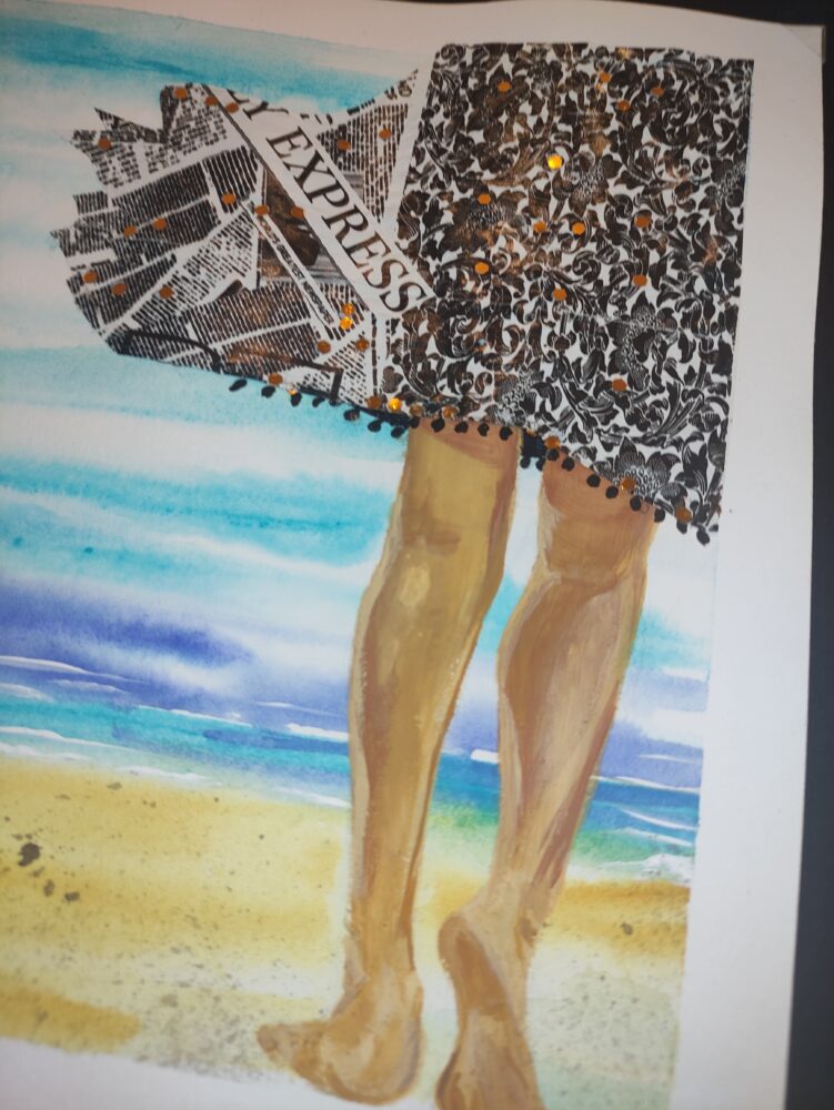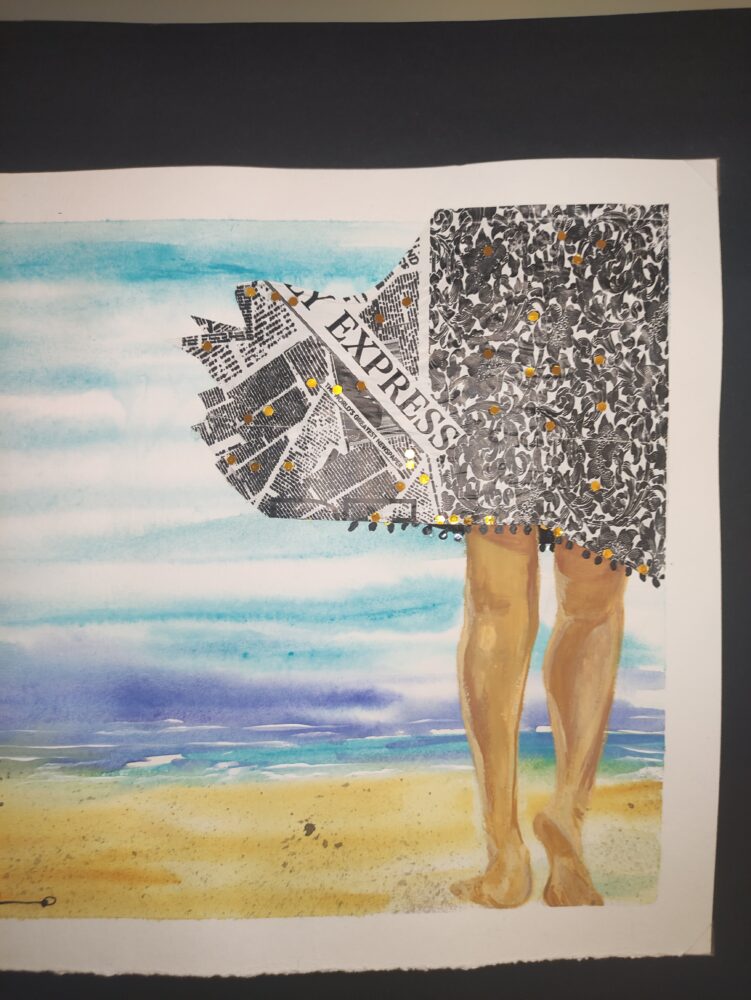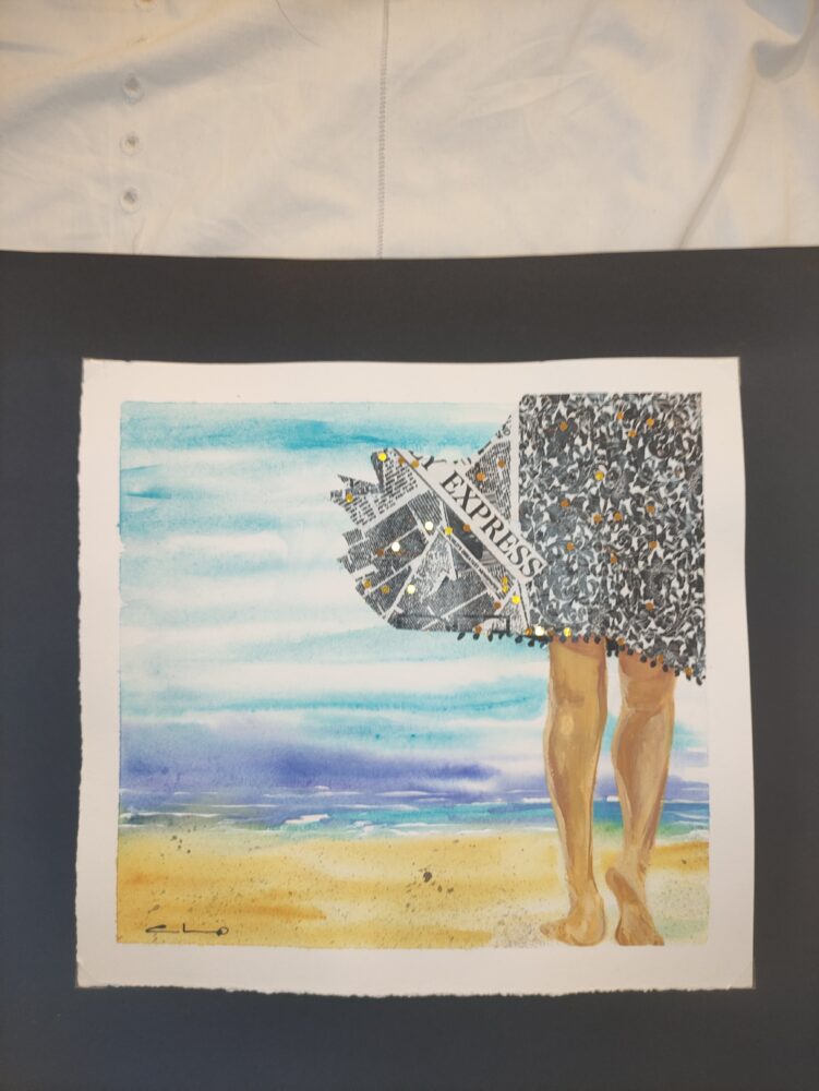 Esta acuarela/collage transmite una sensación de pausa, viento y contemplación, pero también lleva consigo un mensaje potente: el collage con letras y fragmentos de papel en la falda, la palabra «EXPRESS», y los toques de brillo con purpurina hacen que esta figura no solo esté en la playa, sino también entre ideas, noticias, movimiento y contraste.